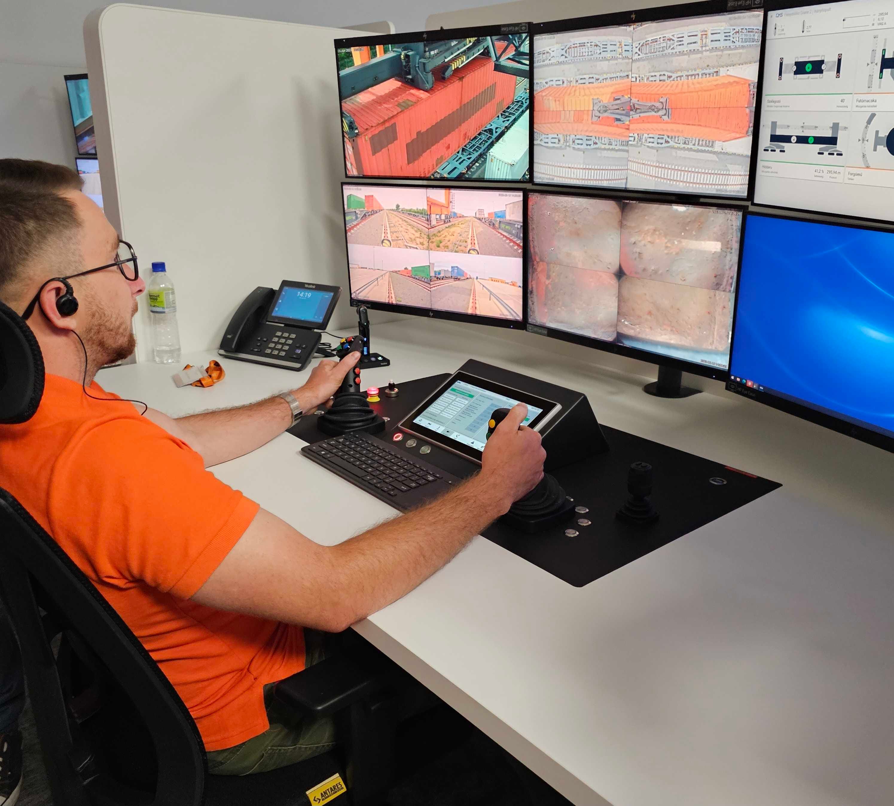 Four large transport cranes tower over the 3.5km site in constant motion locating, picking, and placing container units from incoming trains to outgoing, but strangely absent from the scene are people. Crane operators, ground teams, and security are all absent; instead replaced by hundreds of cameras and sensors that are in constant communication through a private 5G network to a central hub. Inside, teams of remote operators sit in front of banks of monitors armed with dual joysticks controlling the world’s most expensive RC toys.